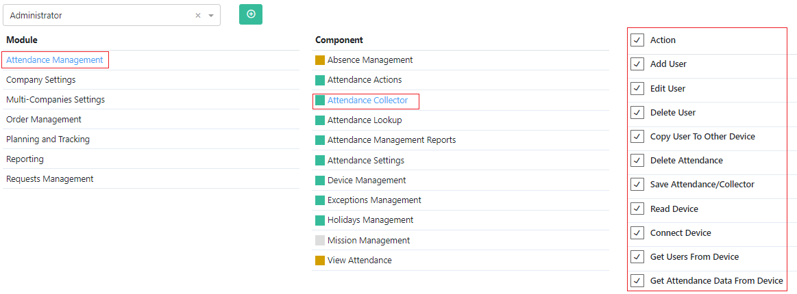 Specific Component in the permissions is dedicated to the Attendance Collector with all actions: