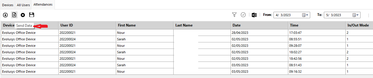 The system will display the attendance events of all employees from all devices: