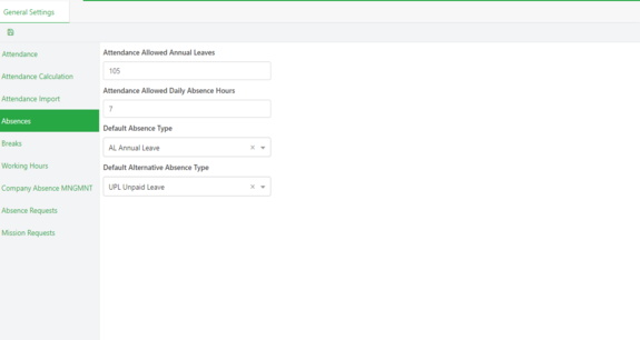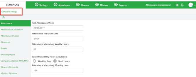 General settings page has multiple tab options that are related to the general setting of attendance management, General setting page opens the attendance tab by default.