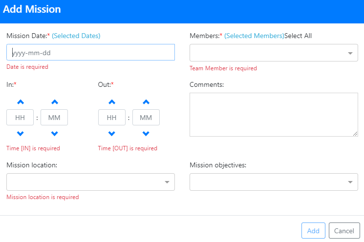 This screen allows the user to add a new mission for one or many team members in one or many dates: