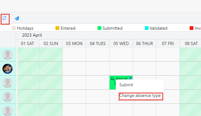 Also when the data imported some team members don’t have attendance the system will display be default the annual leave balance, user go the absence view and select the team member in order to change the absence type if different from annual as following: