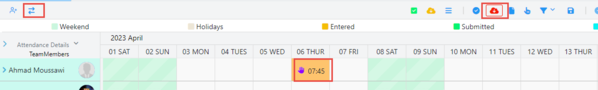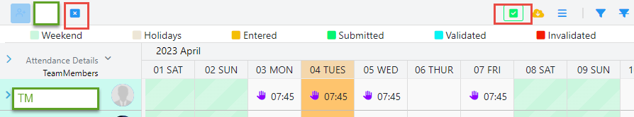 If the user has the permission to modify the data, all actions in the entered screen will have the same behavior. The user can update, delete, or add in and out for attendance. He can also change the absence type and then click on the validate button to validate the attendance.