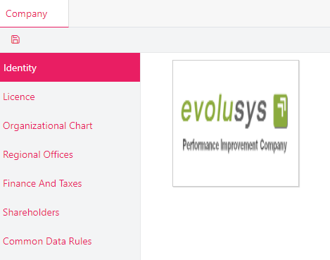 Company Identity displays the company logo and company's info fields such as Name, Display Name (displayed on the left of the menu toolbar), Address, etc.