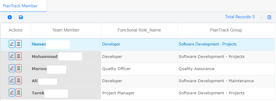 Plan track members includes the list of all team members with their functional roles and plan track group.