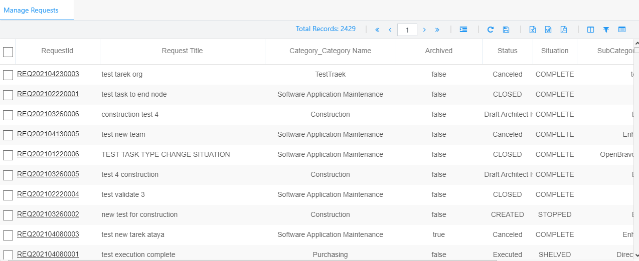 This action is performed on requests with Statusclosed and Situationcomplete. Once reopened, the request moves from this page to My Requests page. The request Status changes to its previous one before closing it, depending on the workflow, and its Situation changes to Active. When the user clicks on Reopen, a justification must be entered before performing the action.