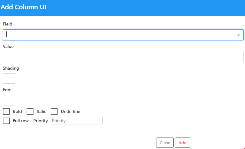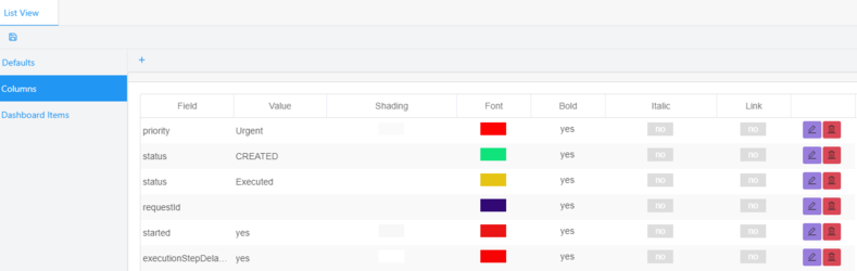 Click on the + button to add a field > Choose a field from the list > Enter a value > Choose the shading and font colors / options desired then click Add to add the field to the list or Close to discard changes along with the fonts (bold, italic, underline) , the whole row in the request list will be colored if the full row checkbox cheeked.