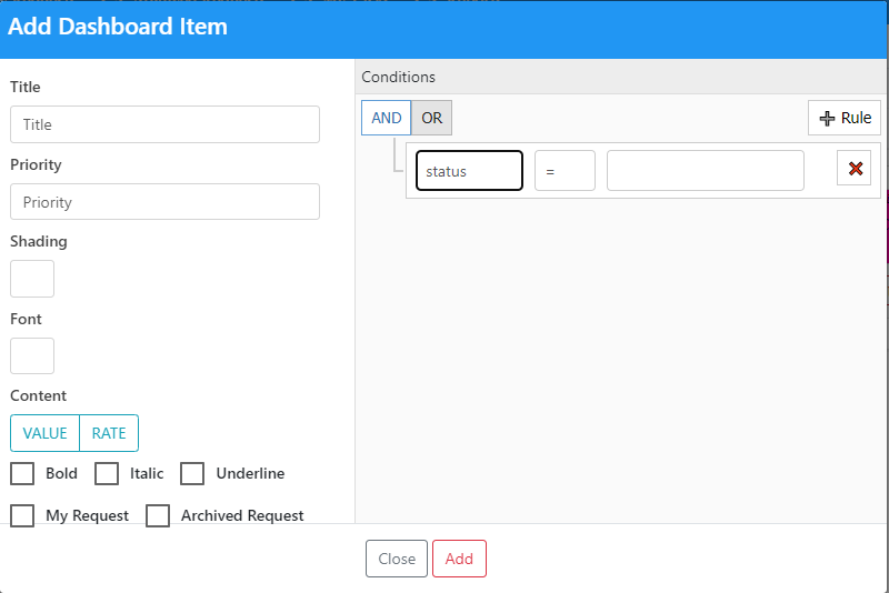 Click on the + button to add a new dashboard item > Enter all necessary fields then create a rule under conditions > also choose where to display the created dashboard by checking MY request or archived Request: